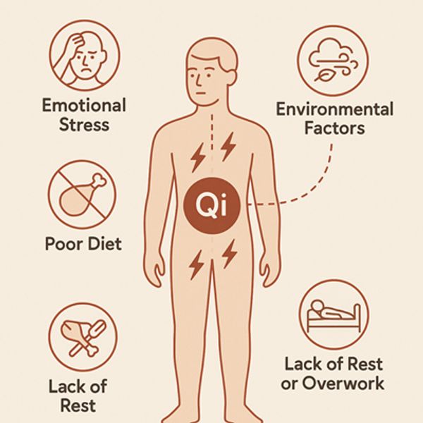 Example: Chronic stress might block liver Qi, leading to digestive issues or irritability.