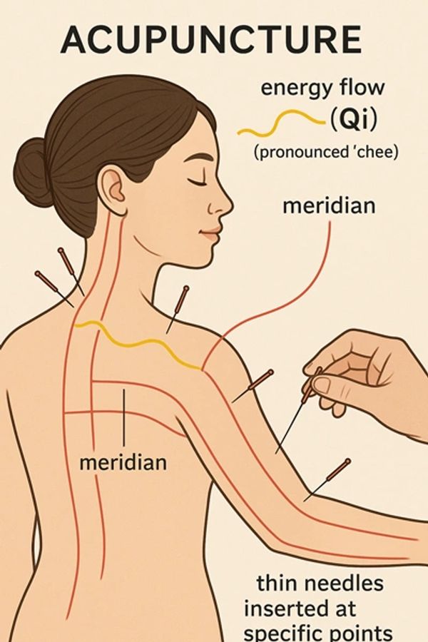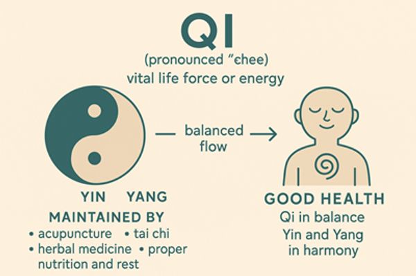 Qi (pronounced “chee”) is a fundamental concept in traditional Chinese medicine and philosophy. It refers to the vital life force or energy that flows through all living things. The idea is that when Qi flows freely and in balance through the body’s pathways (called meridians), a person experiences good health. When Qi is blocked, weak, or imbalanced, it can lead to illness or pain.